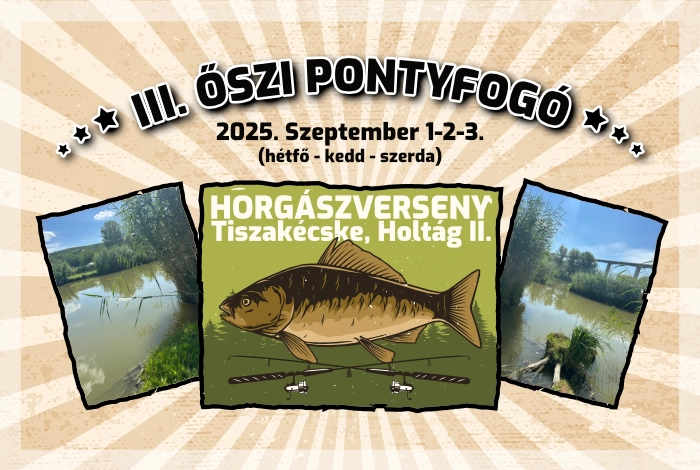 Várjuk Bajtársainkat a III. Őszi Pontyfogó Versenyre Tiszakécskére! Egy igazán hangulatos halfogó verseny várható, ahol helyben készített finom házias ételekkel, üdítővel, kávéval, teával várjuk a versenyzőket.